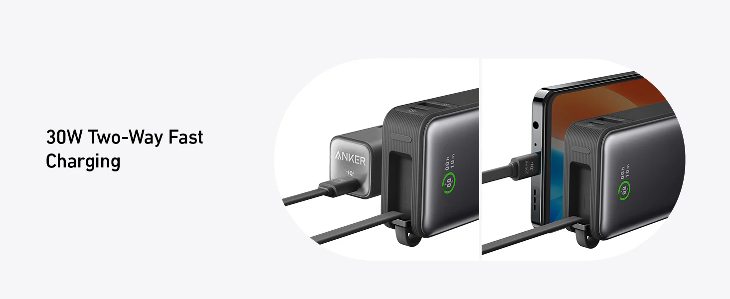 Dvosmerno polnjenje z močjo 30 W: napolnite power bank na 50 % v samo 45 minutah ali dosežete 50 % napolnjenost vašega iPhone 14 v 30 minutah s pomočjo 30 W dvosmernega hitrega polnjenja.