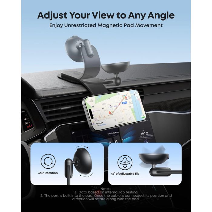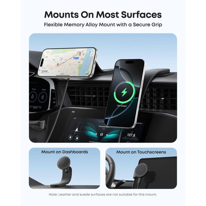 Dizajniran s nosačem od memorijske metalne legure koji se prilagođava zakrivljenim armaturnim pločama i zaslonima osjetljivima na dodir. Savija se do 180° te uključuje magnetsku podlogu s rotacijom od 360° i nagibom od 45°, što omogućuje jednostavno podešavanje idealnog kuta za sigurno korištenje bez ruku.
