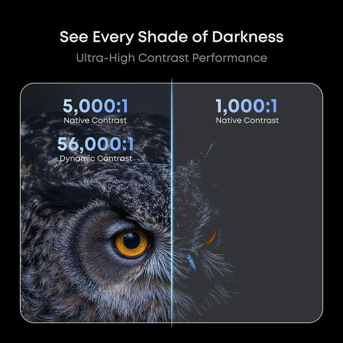 - Oglejte si vsako senco teme z ultra visokim kontrastom: 6-listna zaslonka omogoča naravno kontrastno razmerje 5.000 : 1, nadgrajeno s tehnologijo NebulaMaster, ki doseže impresivnih 56.000 : 1.