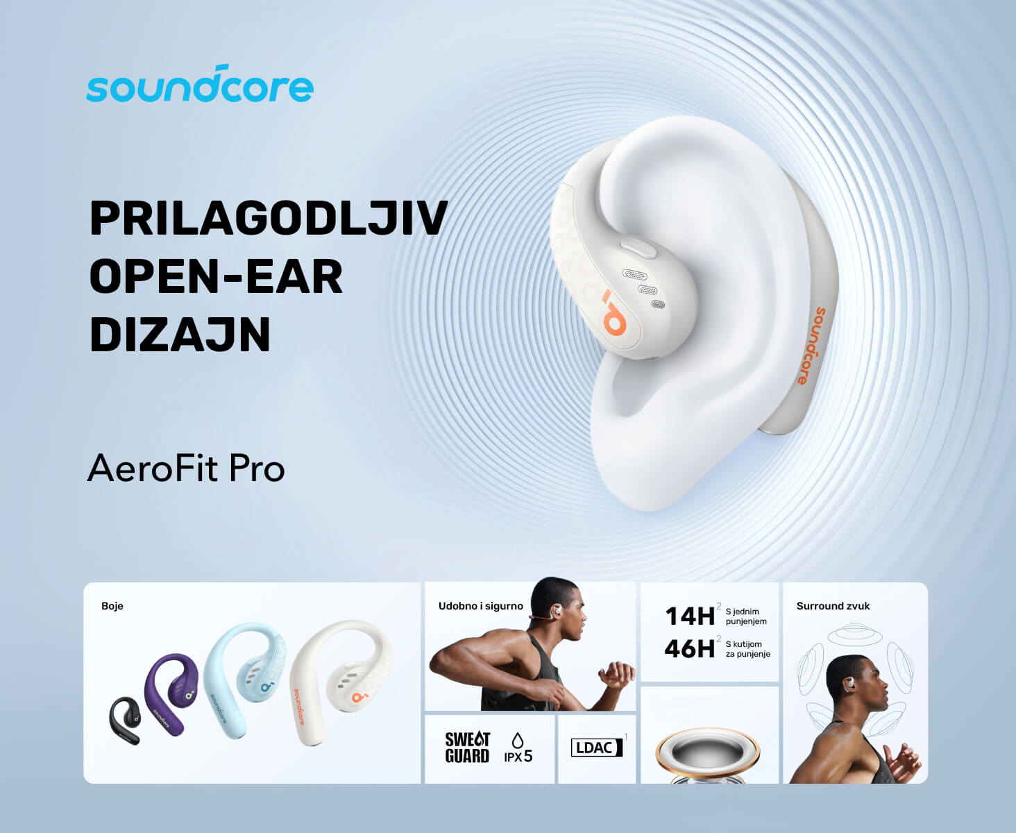 - Nenametljiv dizajn za potpunu udobnost: AeroFit Pro slušalice dizajnirane su za udobno nošenje cijeli dan. Njihov nenametljiv dizajn eliminira nelagodu i omogućuje vam uživanje u glazbi bez ometanja. Zračna provodljivost pruža bogatiji zvuk od koštane provodljivosti, dok uši ostaju otvorene za zvukove iz okoline.